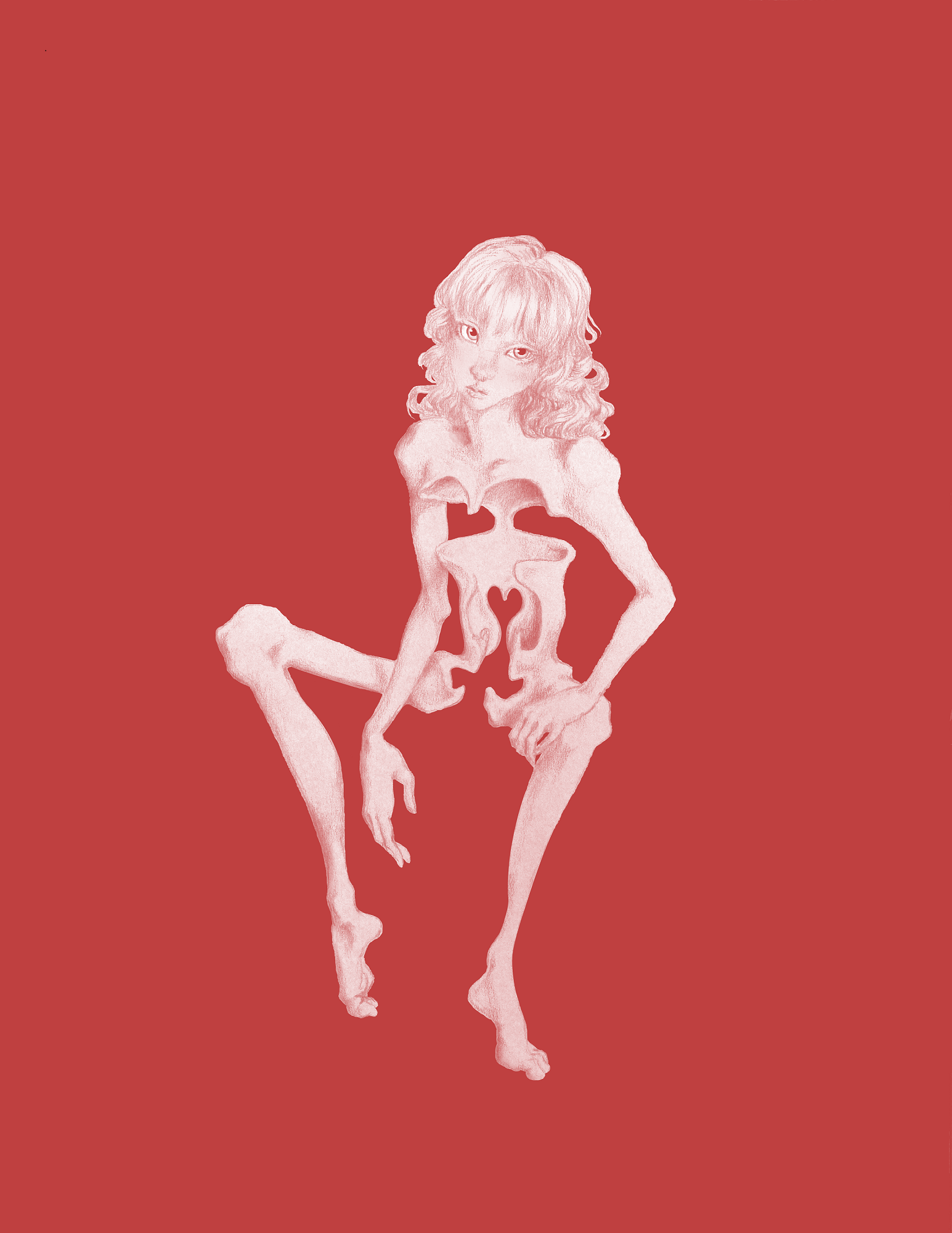 A meditation on asexuality, the desire to escape from sexuality, and the necessity of all body parts for life. Pencil drawing, background added in Photoshop, printed on transparent plastic.