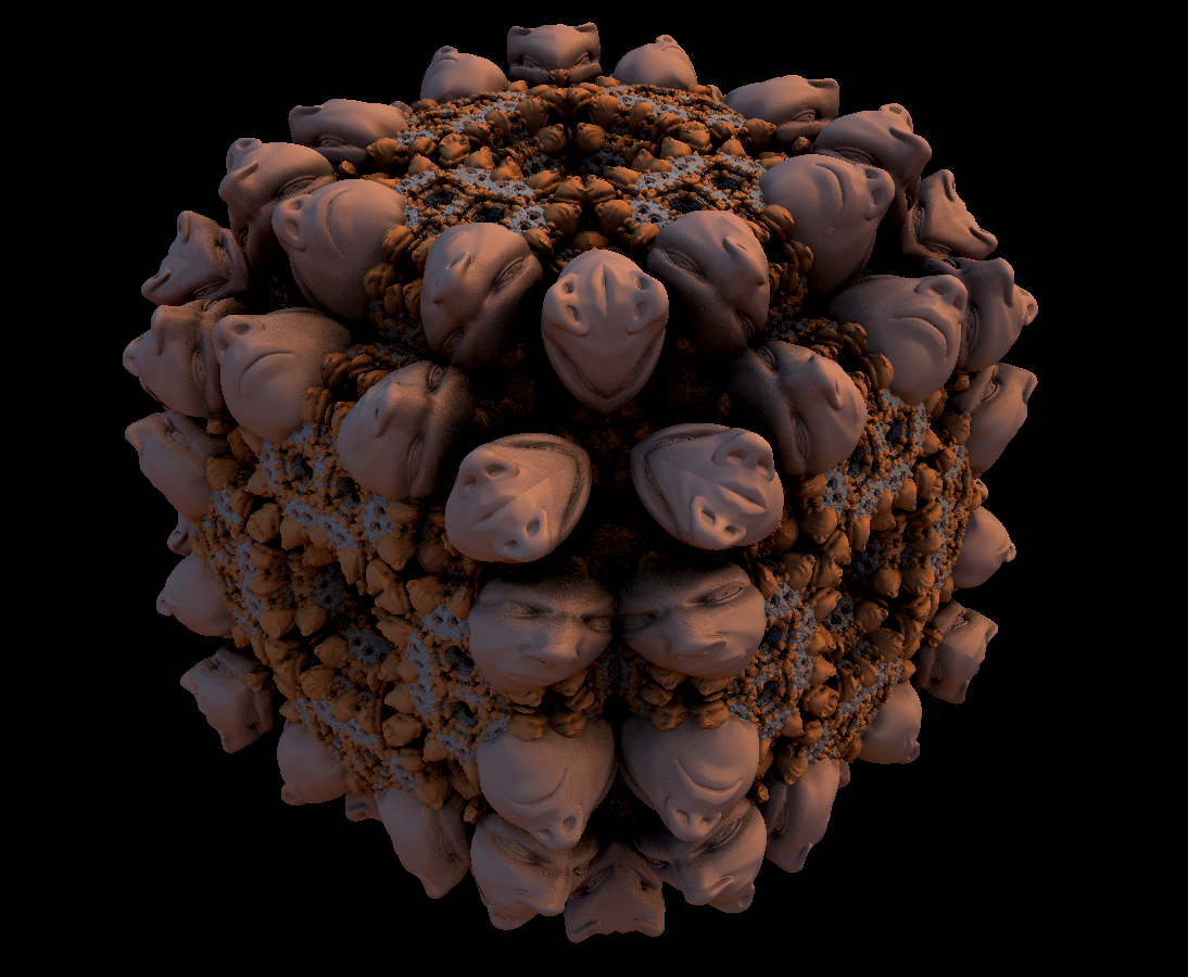3D fractal addressing issues of group-think and collective suffering. All shapes are human faces, created by applying a height map of a human face to a sphere. Based on the Menger Box formula.