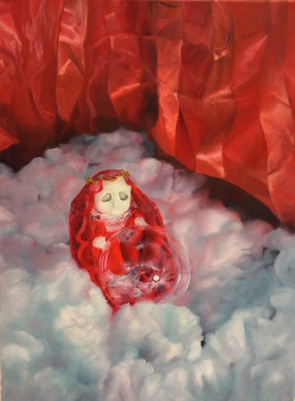 An oil painting depicting a doll and scene that I built using polymer clay, marbles, satin, lace, cotton, beads, and an ornament. Reflecting in her glass orb (representing art), the cotton world around her looks like real clouds.