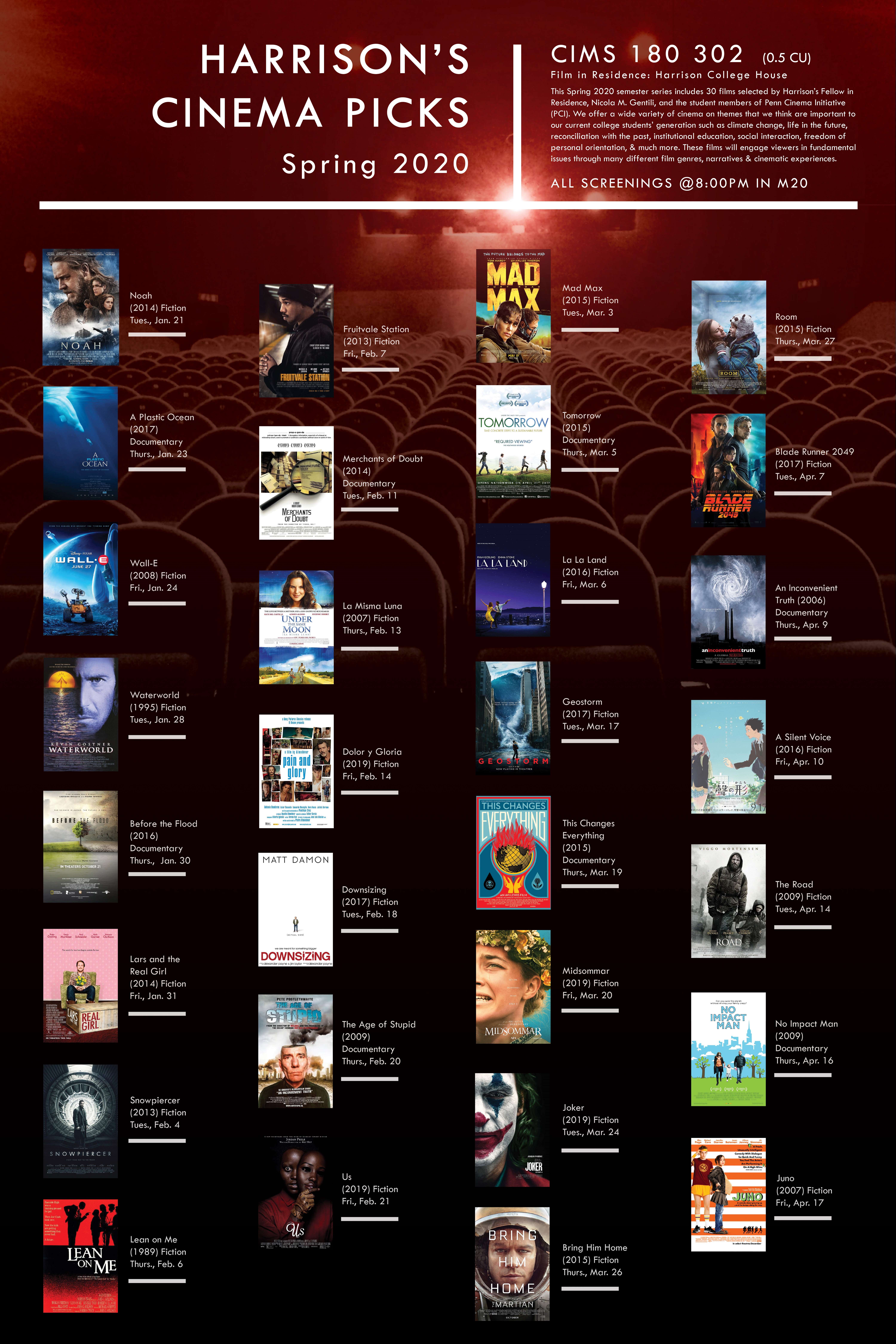 A 24 by 36 in. poster displaying the films to be shown for the University of Pennsylvania's Cinema 180 course, created in my role as Art Director at Harrison College House.