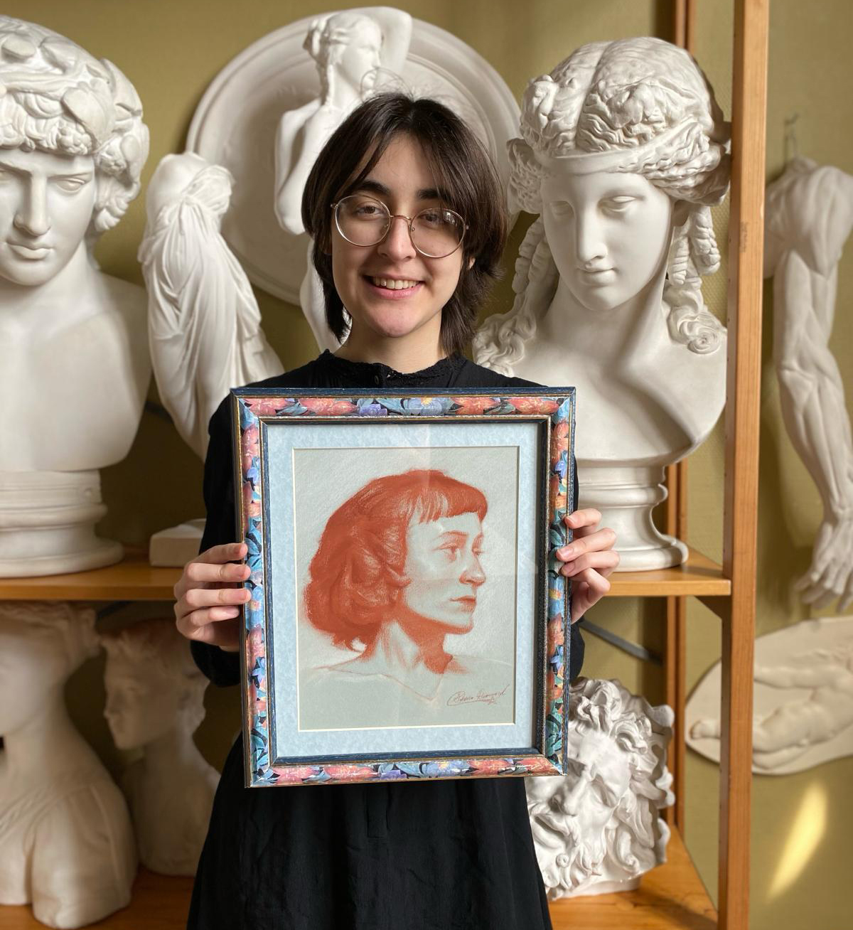 This is a portrait of a fellow artist. I created it during a three hour live drawing session. The second image is me shortly after framing the drawing. This drawing has been sold.