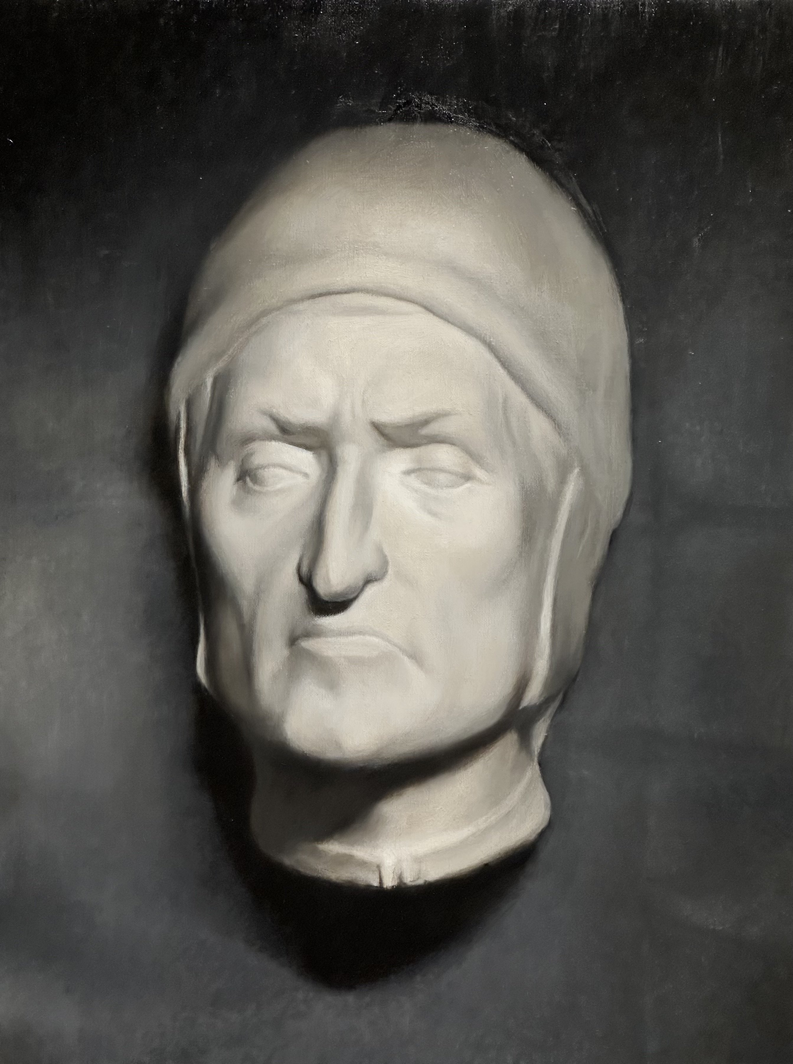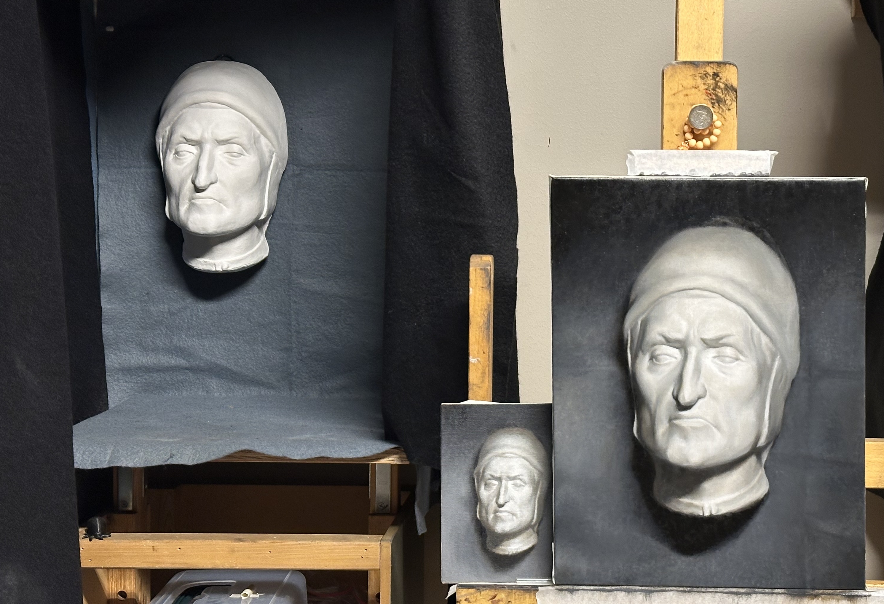 Painted from life. The first image shows the final painting. The second image shows the cast setup and preparatory color study in oil.