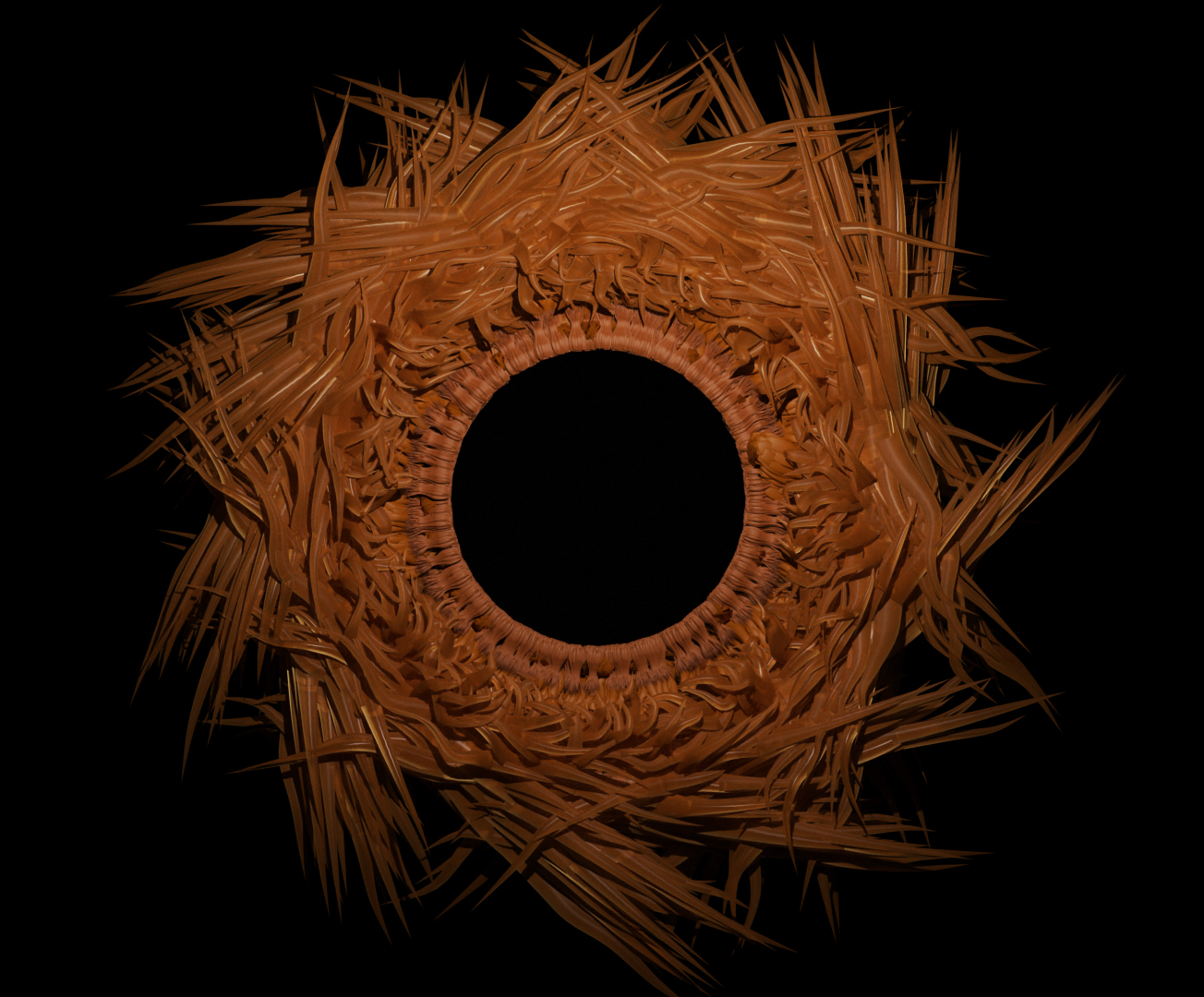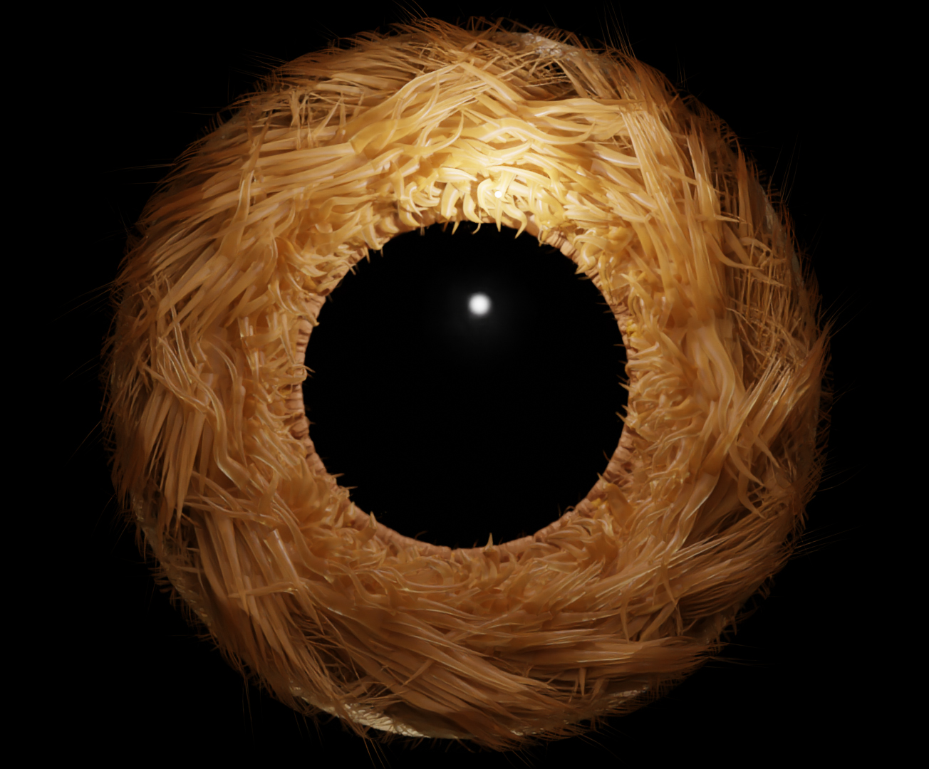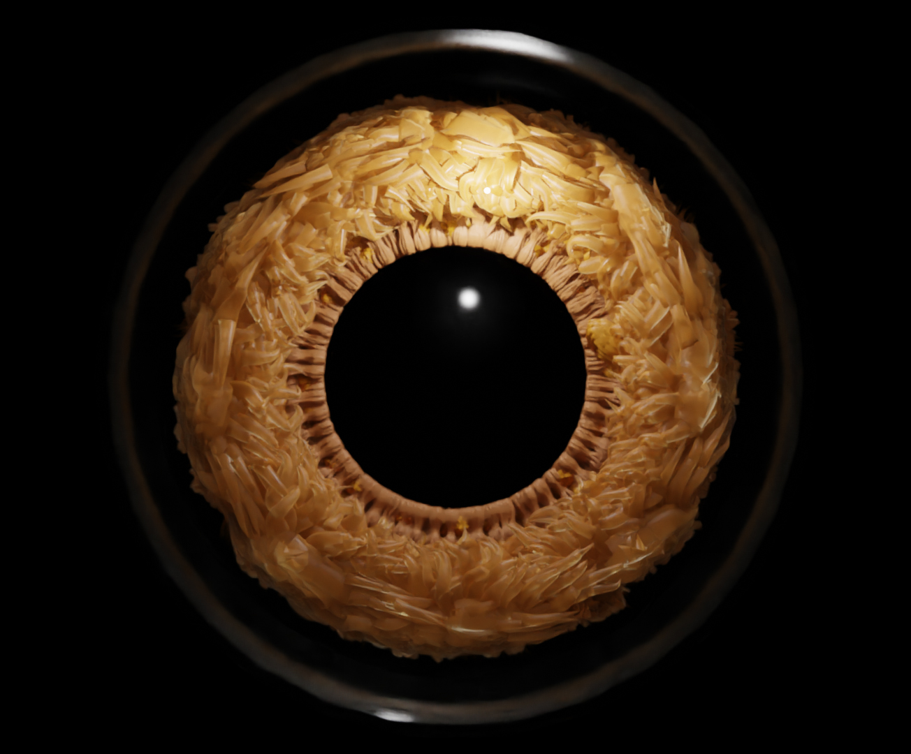 The iris of an eye unfolding into an abstract circle in three stages. Modeled using Blender's geometry nodes and rendered with Cycles.