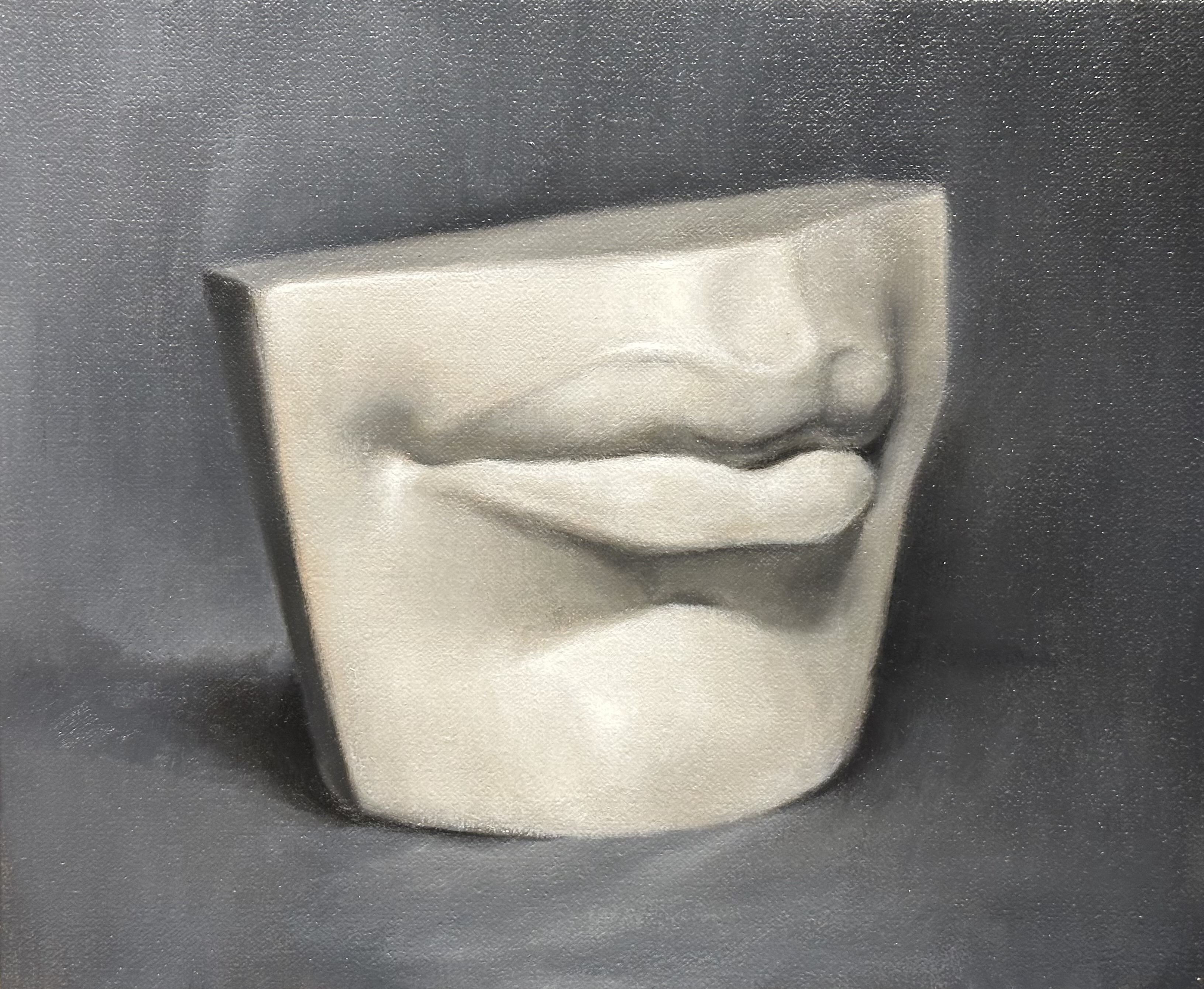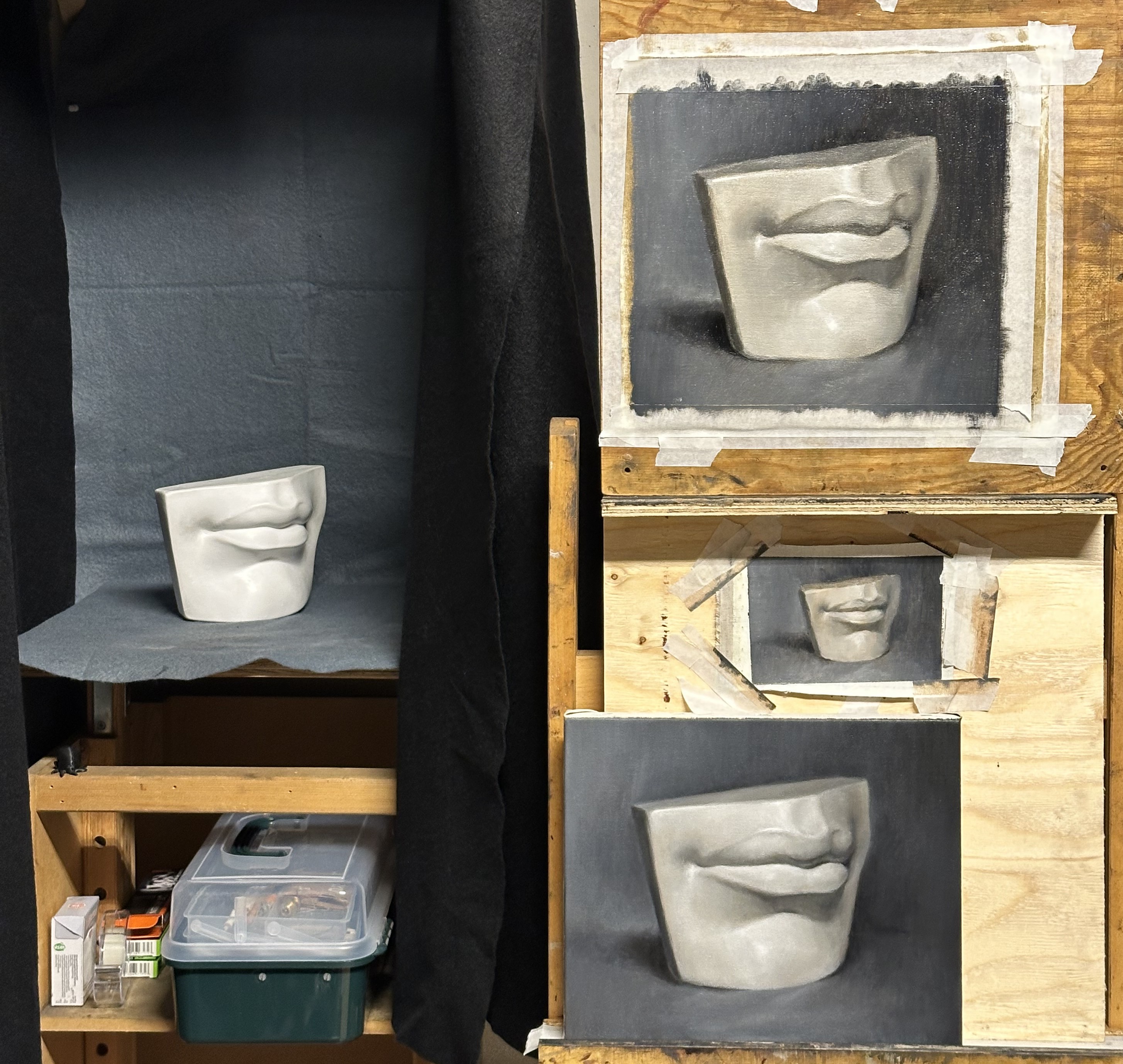 Painted from life. The first image shows the final painting. The second image shows the cast setup and preparatory color study in oil.