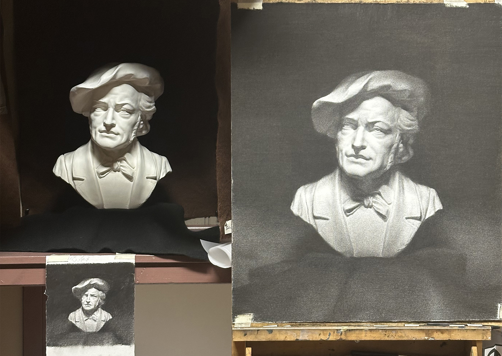 Drawn from life. The first image shows the final drawing in charcoal. The second image shows the cast setup and small value study, along with the finished drawing.