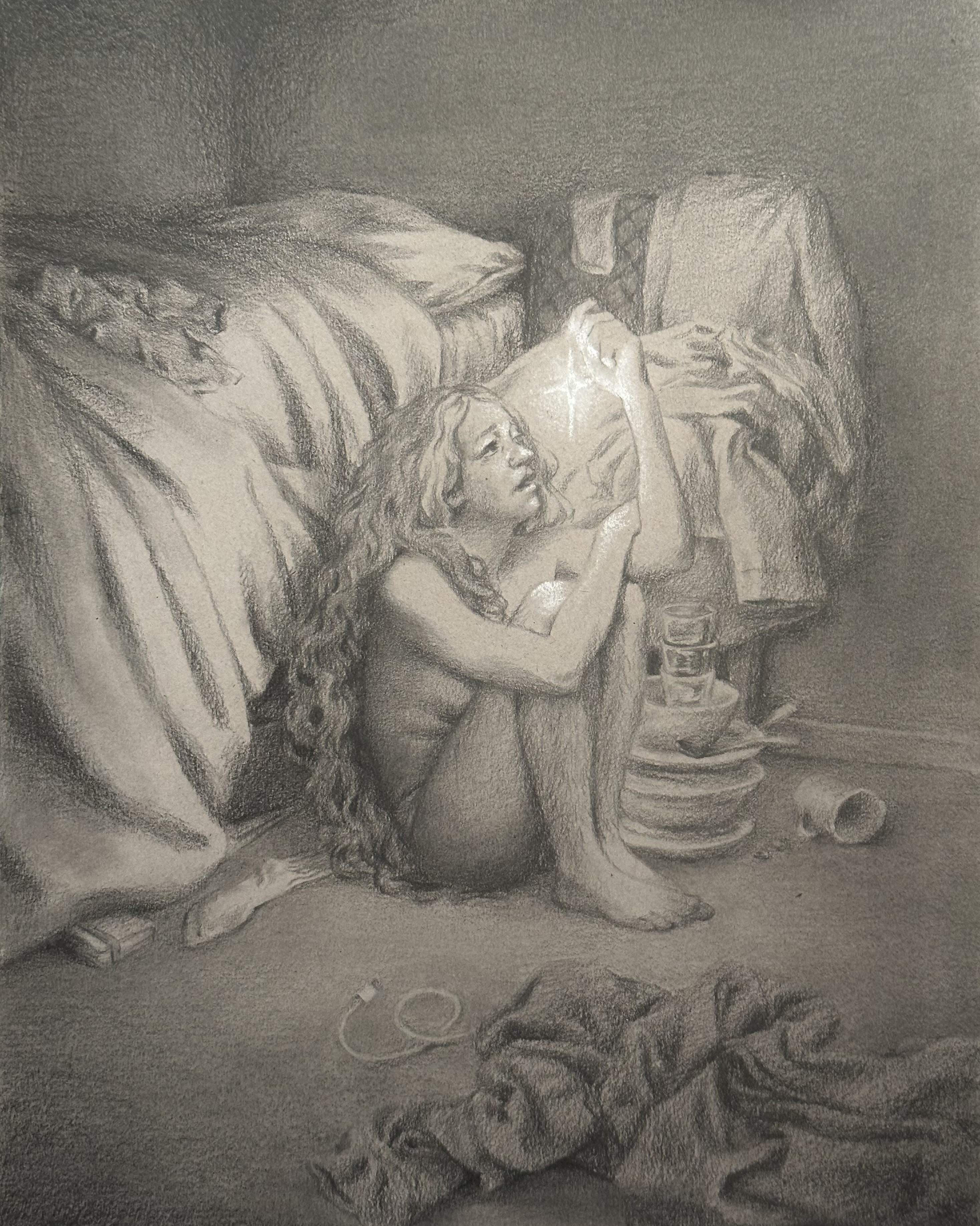 With its long hair, my image alludes to a present-day, darker, more delusional successor to Mary Magdalene, who becomes lost in obsessive thoughts. Are these thoughts really put in her head by god? Who can say? But ironically, while she worries so much about whether she is doing the right thing and how she might have sinned, her life is falling apart. She is not doing her laundry and dishes, not even bothering to get dressed most days, and so on. In short, she is in an OCD episode. Only the desperate thoughts burn brightly at the center of the filth and chaos, promising that she will find a way to atone if she just thinks about it one more time...