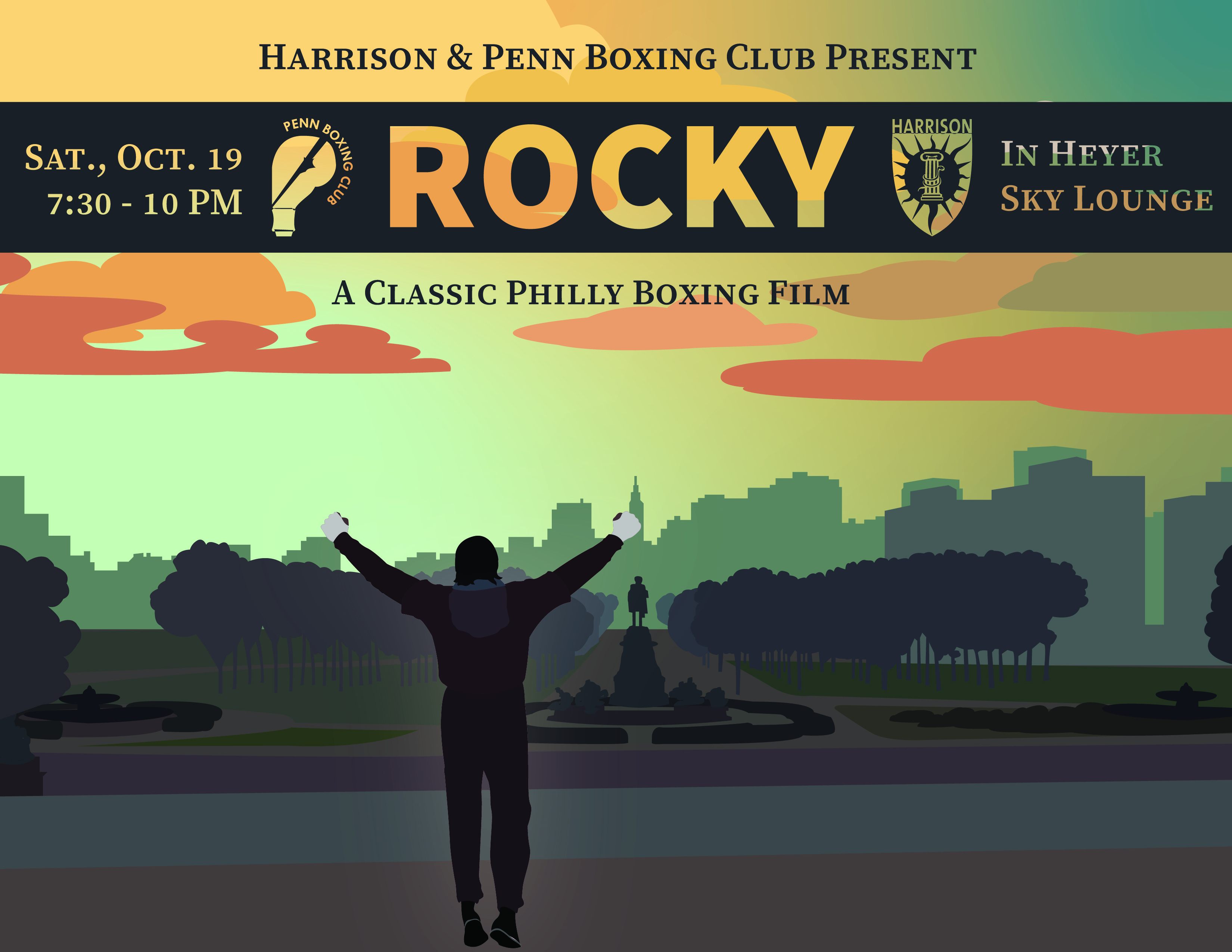 Poster advertising a showing of Rocky using a vectorization of a frame from the film. I also designed the Penn Boxing Club's logo, which appears in the upper banner. A project undertaken as Art Director at Harrison College House.