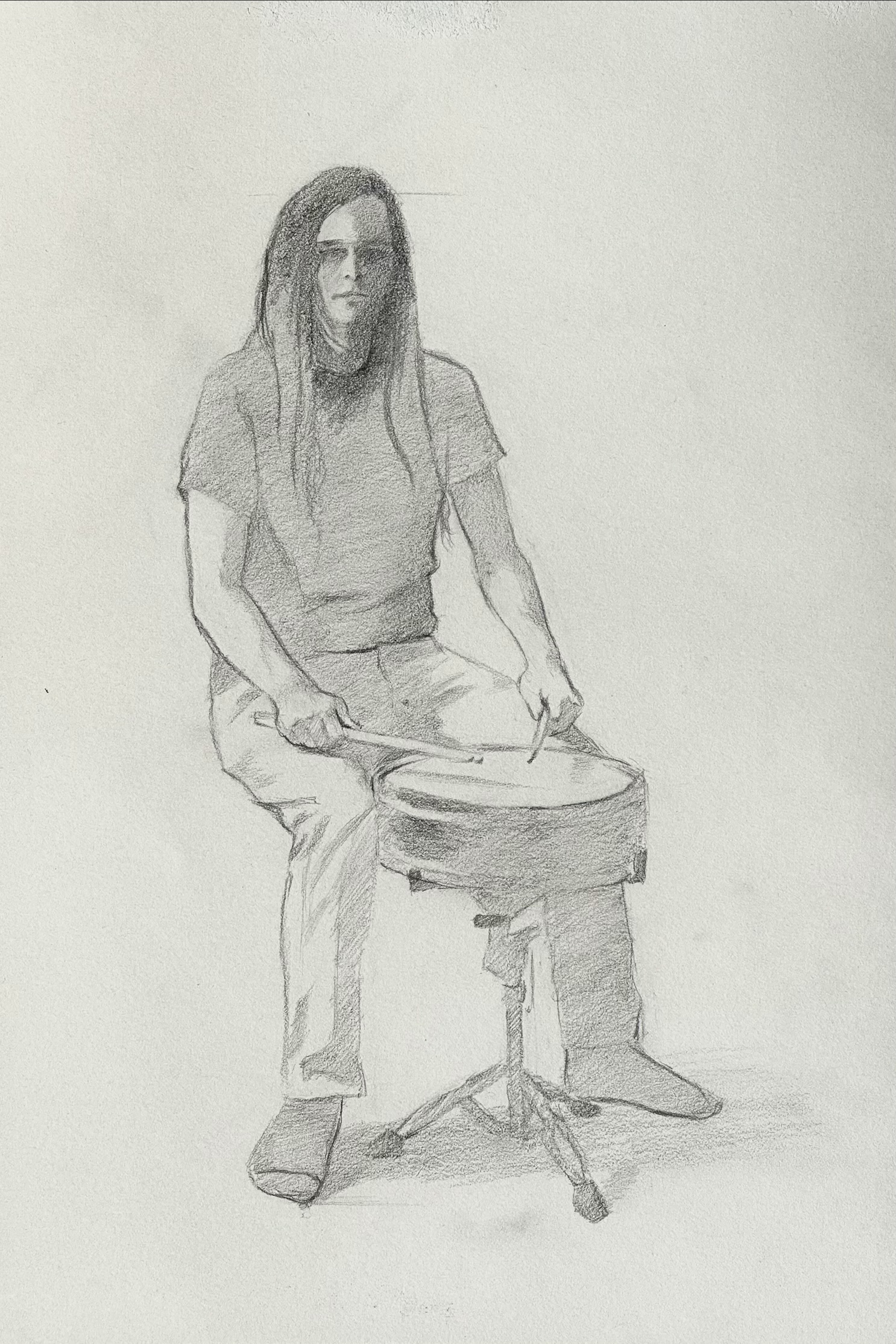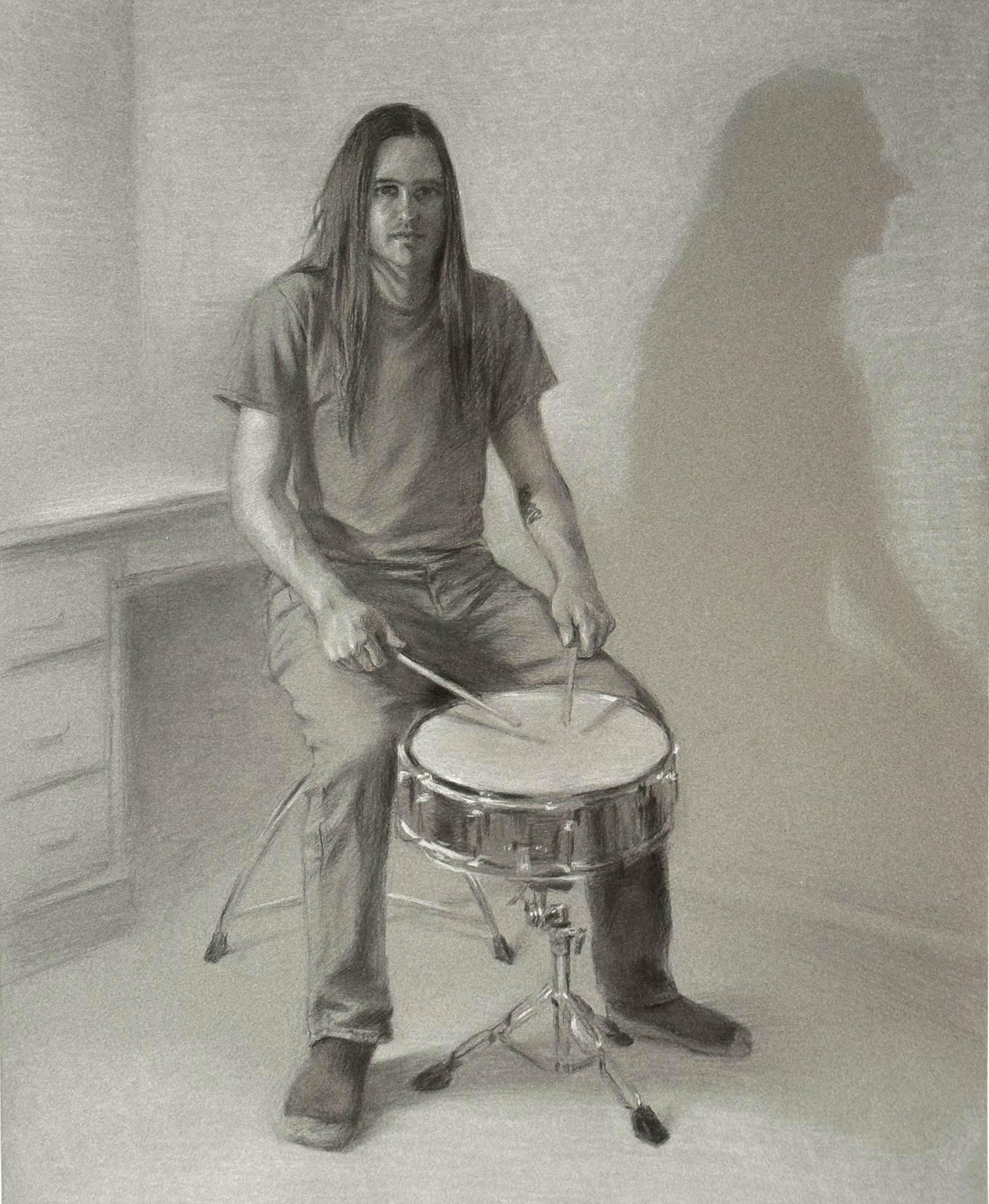 Drawn from life to represent the relationship between a drummer and his instrument. The second image is a preparatory sketch in graphite for the final charcoal and white chalk drawing.