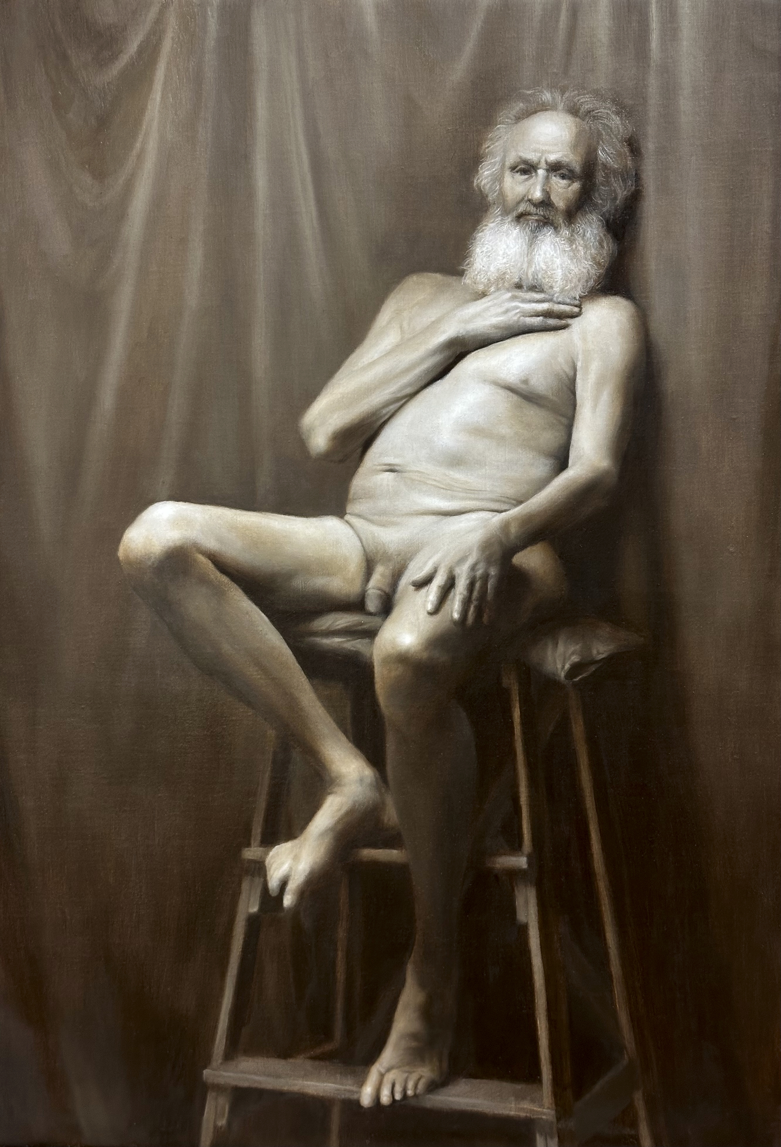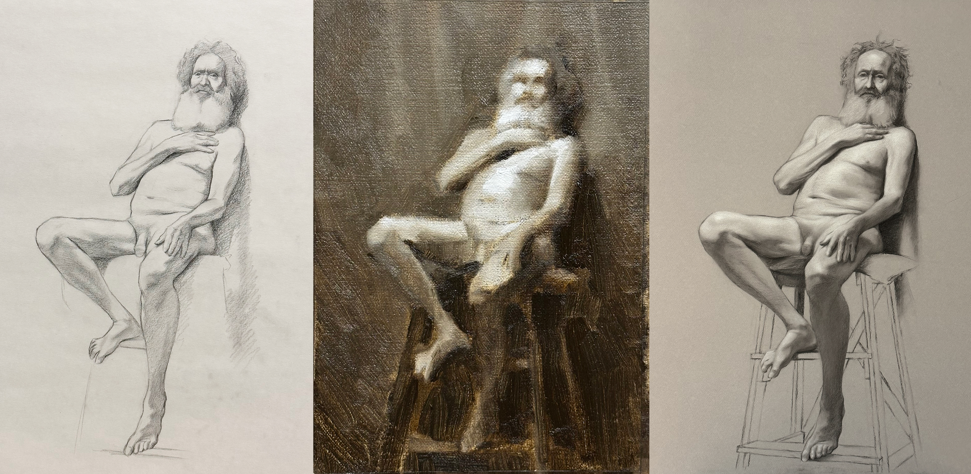 Painted from life over the course of four weeks. The first image shows the final painting. The second image shows the preparatory sketch in graphite, color study in oil, and transfer drawing in charcoal and white chalk.
